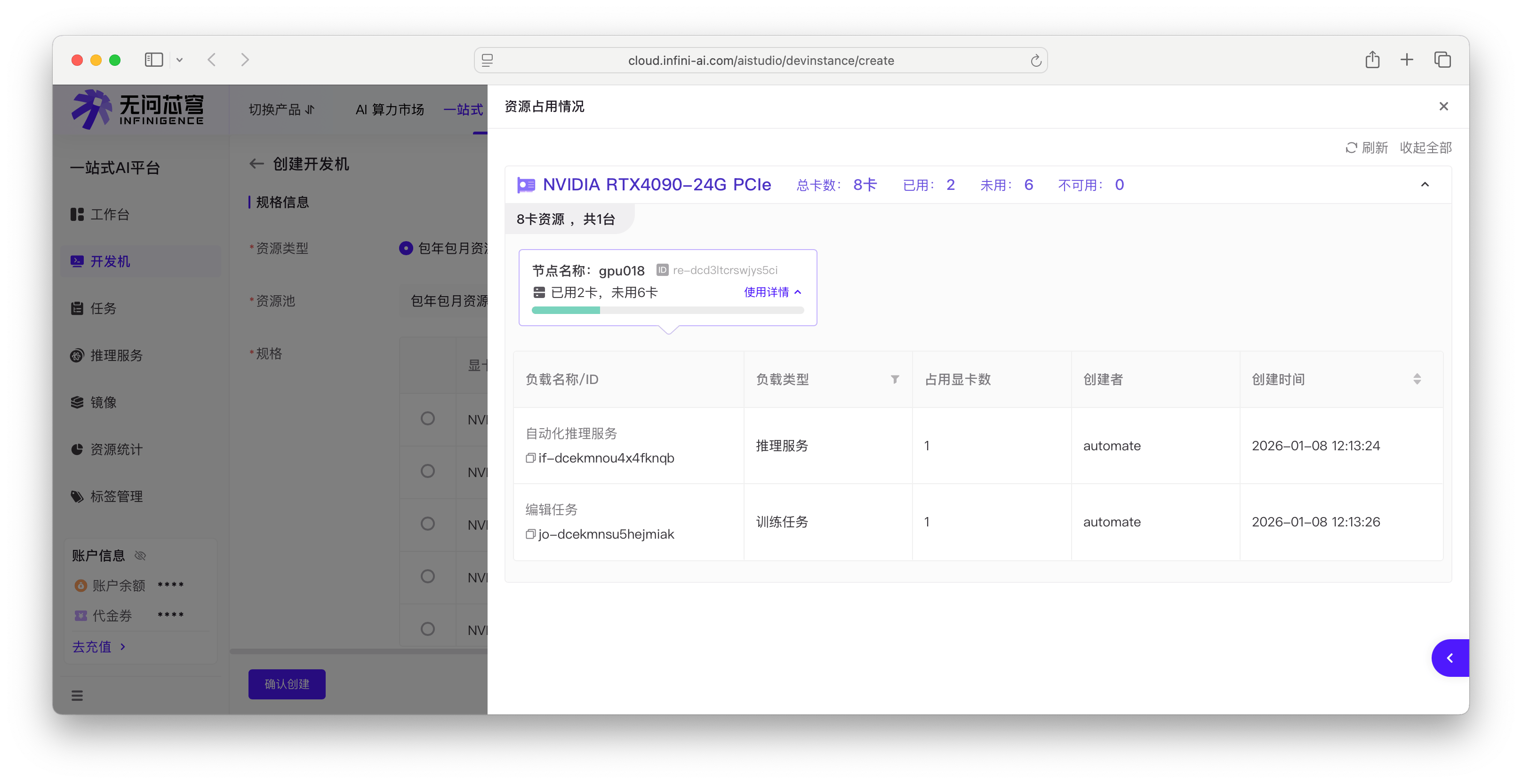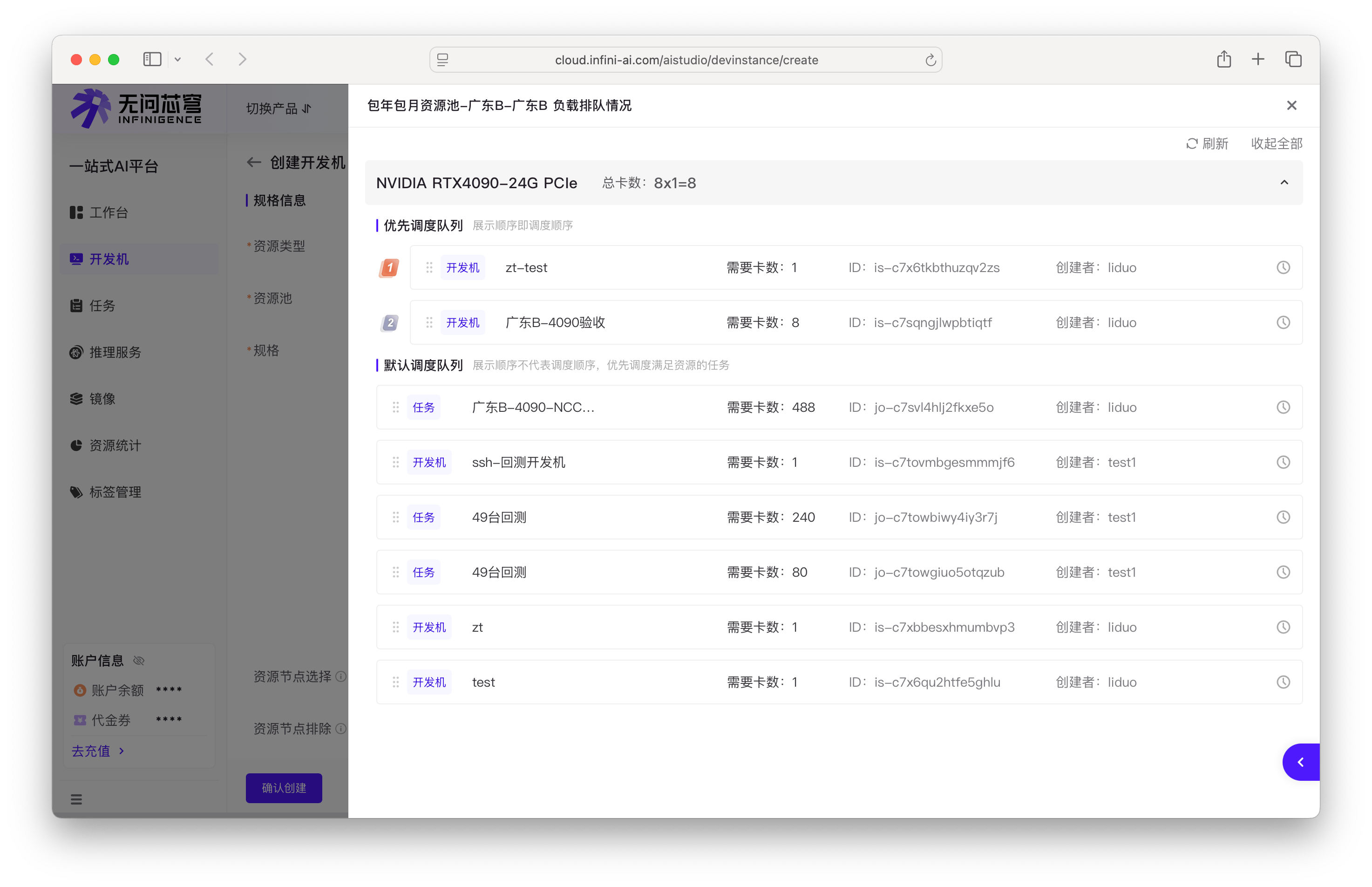- 节点列表:按规格分组显示节点(如"8卡资源,共3台"),每个节点显示已用和未用的 GPU 数量