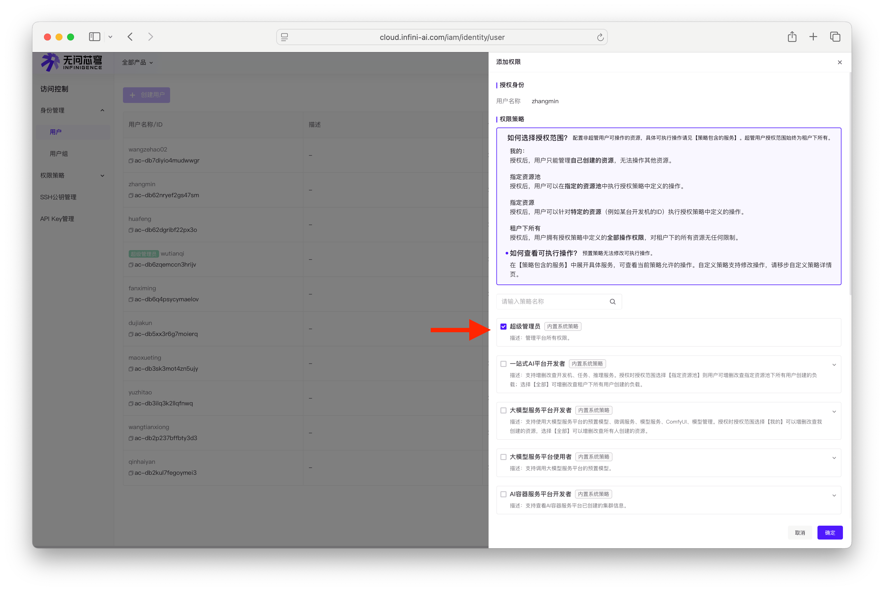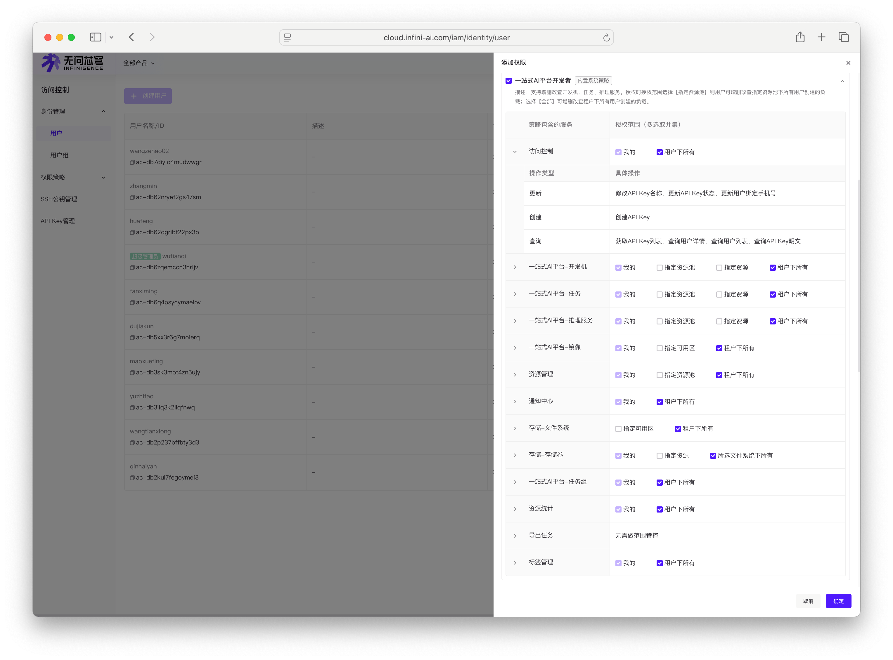 - 在权限管理页面,添加权限策略:一站式 AI 平台开发者