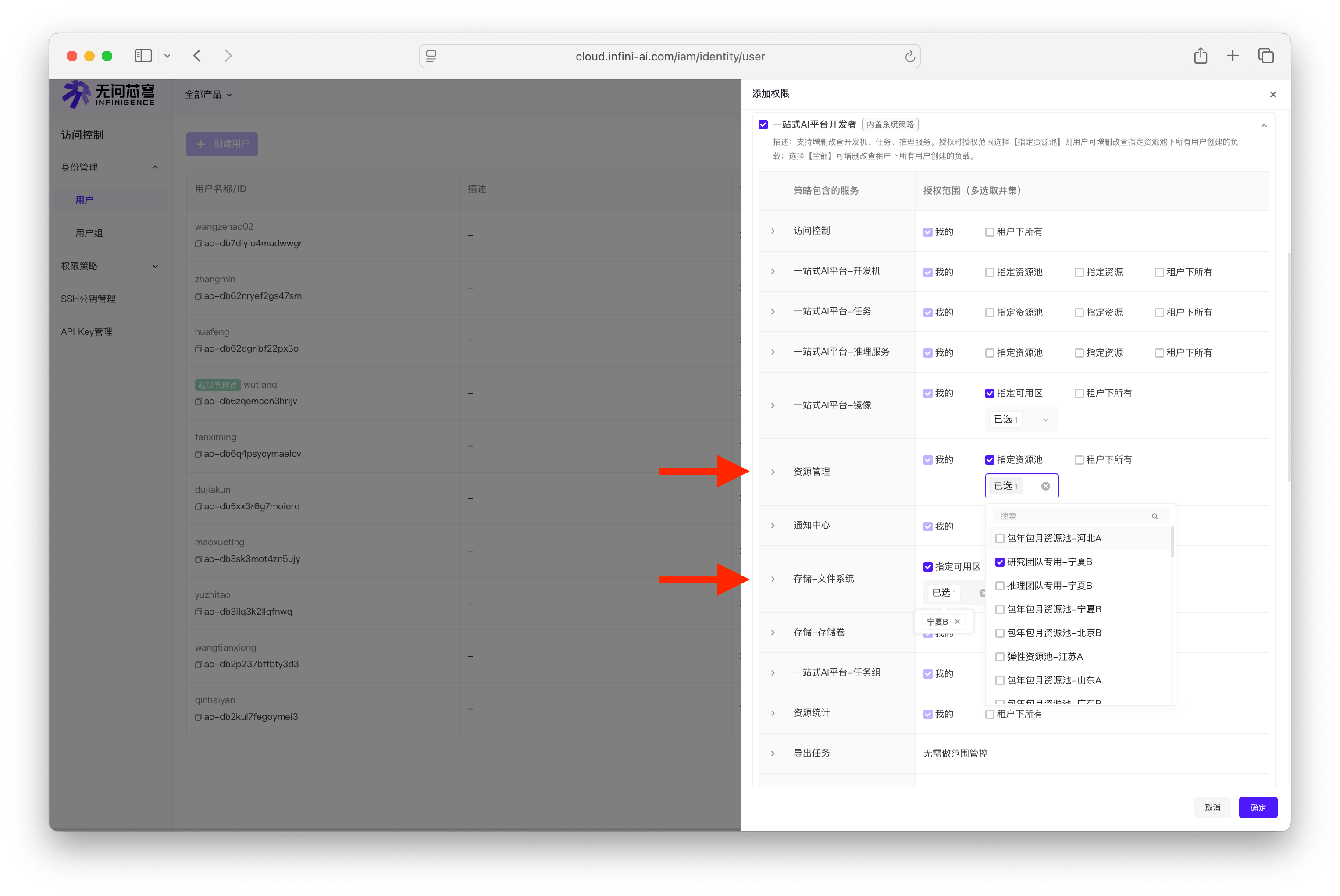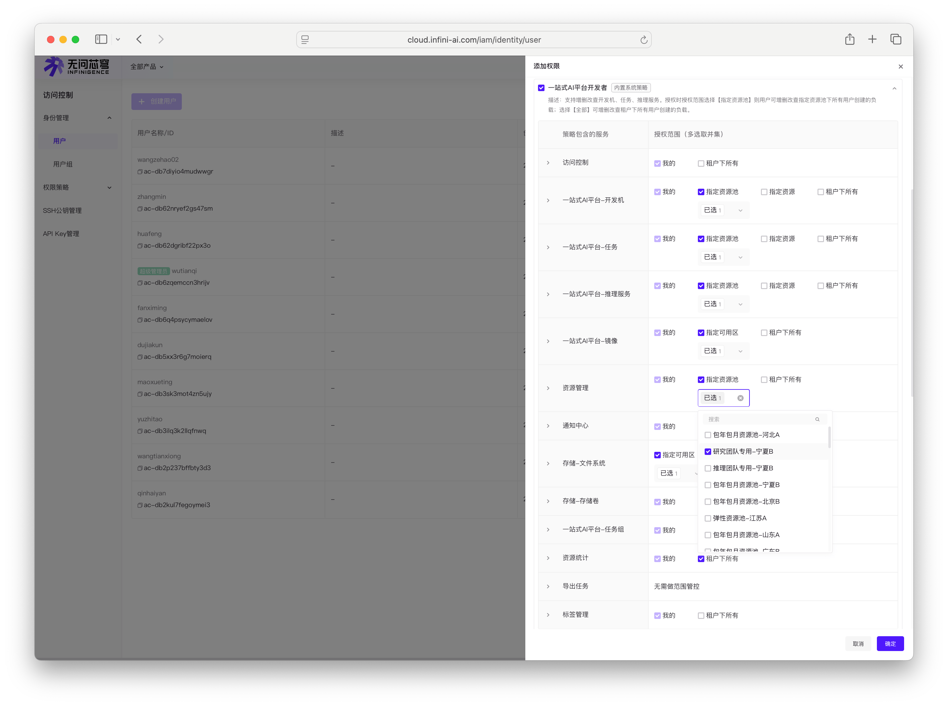适用场景:限制用户(组)只能使用特定资源池(如「研究团队专用-宁夏 B」),实现资源隔离。