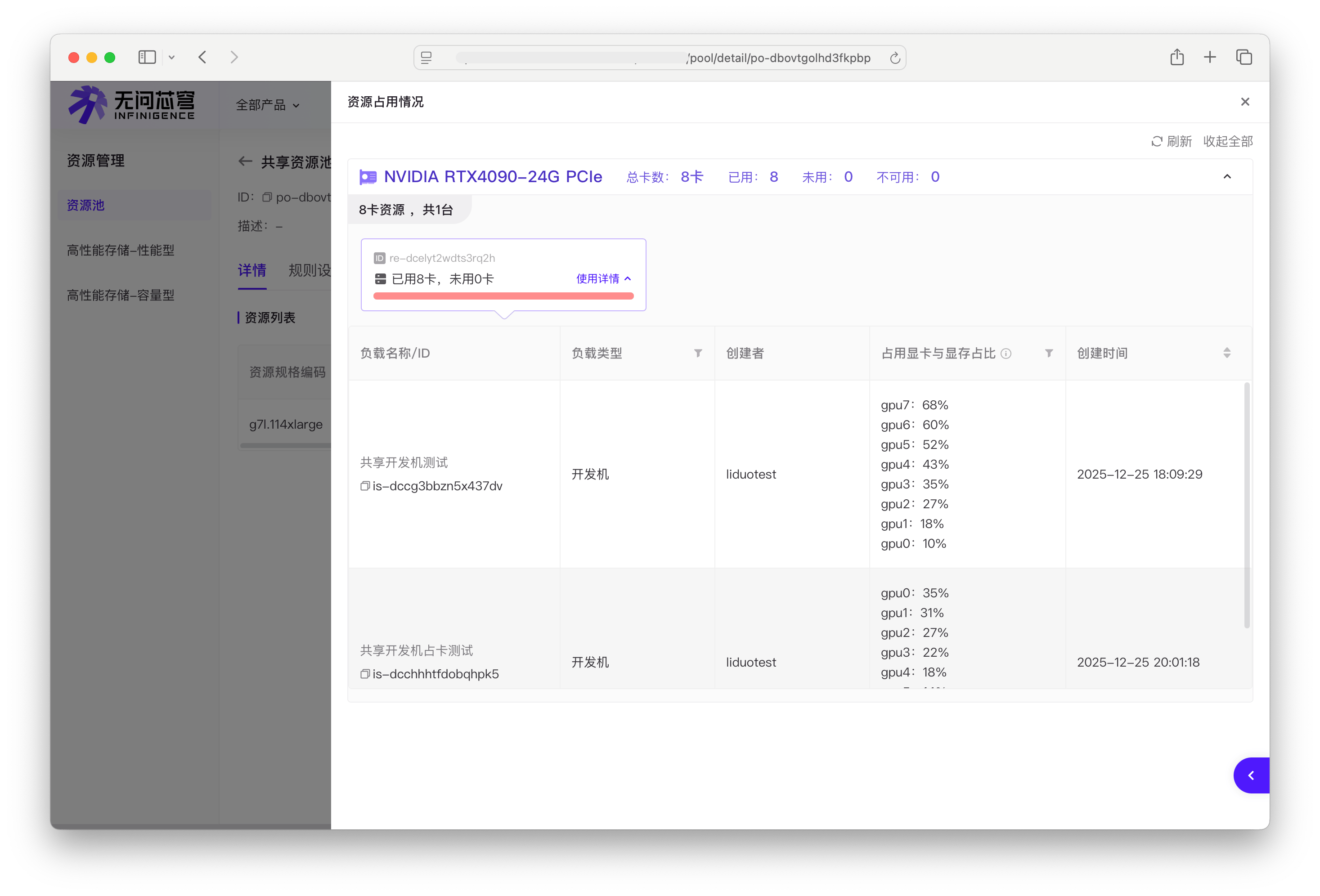 - 在资源池详情页,切换到资源列表标签页,在资源节点记录右侧的负载信息列中点击详情按钮。