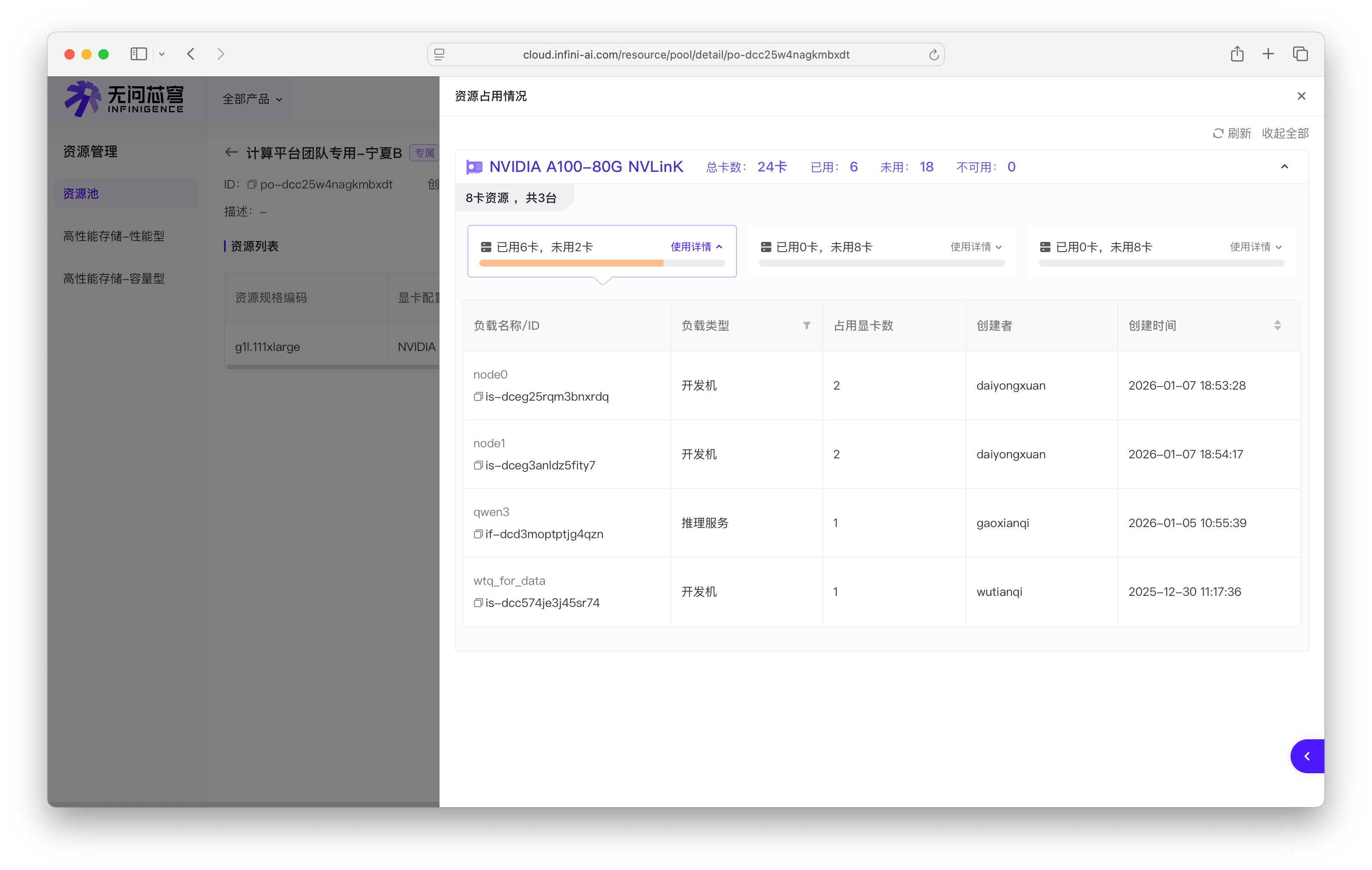 按节点规格分组展示(例如"8卡资源,共3台"),列出资源池中的所有节点。每个节点卡片包含: